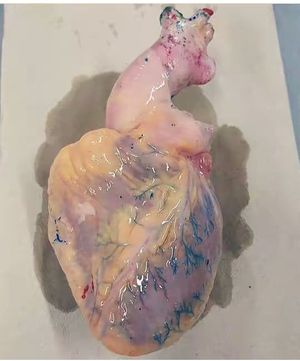 This is a heart of a patient suffered from an infarction. Infarction is tissue death (necrosis) due to inadequate blood supply to the affected area. It may be caused by artery blockages, rupture, mechanical compression or vasoconstriction. The resulting lesion is referred to as an infarct.