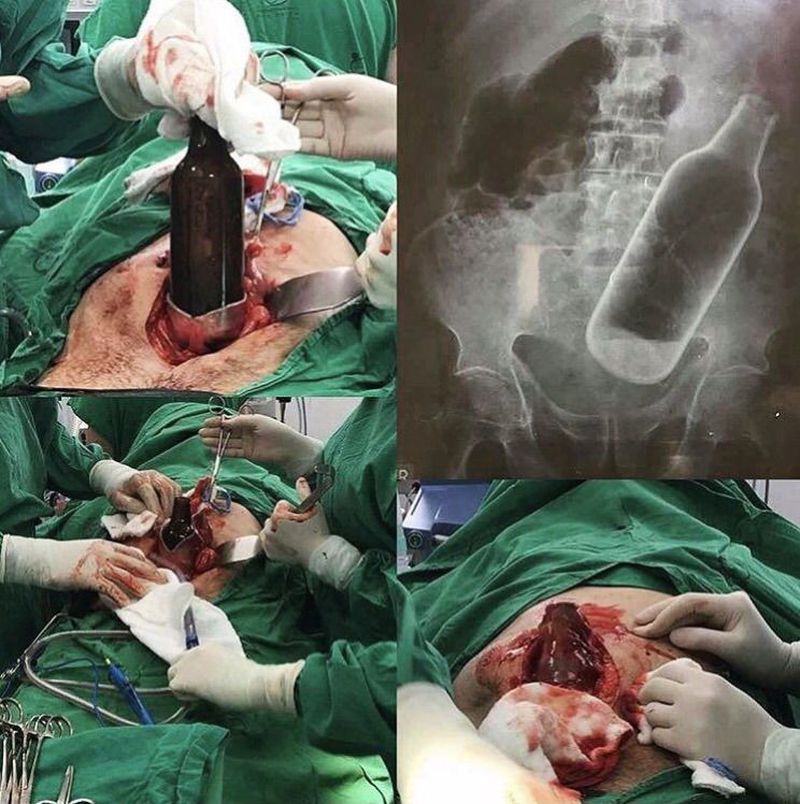 A beer bottle won't do good for your rectum! This man presented to the emergency department with profuse rectal bleeding, abdominal pain, and an altered mental status.A foreign body was found on rectal examination but was not visible, took a plain-film radiography of the abdomen and voila - reveals a beer bottle lodged in his rectum. The doctors were not able to manually extract the bottle and had to surgically remove it.