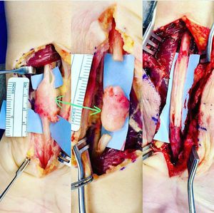 This is a case of a patient that had his wrist nerve cut and the mass labeled with the green arrows developed. This is called a neuroma and can cause pain and does not conduct proper sensory and/or motor signals. This patient's neuroma was cut out and the nerve had to be reconstructed. There are many philosophies of nerve reconstruction, but I prefer this method. Here, a sural nerve from the leg was taken and 4 nerve cables were attached using microsurgical technique. You can see the cables in the middle of the photo on the right. Now, on to recovery. Thank