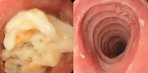Images in Clinical Medicine: “Trachealization” of the Esophagus. ⠀ ⠀ A 32-year-old man presented to the emergency department with difficulty swallowing oral secretions and the feeling that food was stuck in his throat after he ate a pizza roll. The patient reported that similar episodes had occurred previously, but in each instance the feeling resolved spontaneously, and he did not seek medical care. At the time of presentation, the patient was drooling. Upper endoscopy revealed impacted food material (Panel A) and prominent mucosal rings extending 20 cm from the incisors to the level of the gastroesophageal junction, with two discrete areas of narrowing and associated linear furrows (Panel B). Biopsy specimens were obtained, and esophagitis was observed, with more than 40 eosinophils per high-power field. An endoscopic finding of fixed esophageal rings, or “trachealization,” is suggestive of eosinophilic esophagitis, although a definitive diagnosis is made on the basis of clinical presentation, histologic findings, and the exclusion of other causes of esophageal eosinophilia, such as proton-pump inhibitor–responsive esophageal eosinophilia.