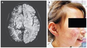 A 6-year-old girl was brought to the emergency department after the sudden onset of weakness in the left arm and leg. She also reported a 2-day history of pain in her right eye. No seizure activity had been witnessed. She had a nonpalpable red lesion on the right side of her face, and the intraocular pressure was elevated in both eyes. Magnetic resonance imaging (MRI) of the head revealed right cerebral atrophy with leptomeningeal enhancement along the right cerebral convexity. Susceptibility-weighted MRI (Panel A) revealed abnormal leptomeningeal capillary vessels along the right cerebral convexity. The MRI and clinical findings were consistent with the Sturge–Weber syndrome, a rare congenital vascular disorder characterized by a cutaneous capillary malformation, also called port-wine birthmark (Panel B shows the patient’s face 2 years after the initial presentation), and abnormal capillary venous vessels in the brain and eye that can lead to glaucoma, seizures, stroke, and intellectual disability. The weakness on the left side, which was thought to be postictal paresis, resolved within 24 hours. An antiepileptic medication was prescribed, as well as timolol and dorzolamide for glaucoma and daily low-dose aspirin treatment to reduce the risk of thrombotic events. Over the next 2 years, she had two presentations with seizures, which led to adjustment of the antiepileptic regimen. Shivang Desai, M.D. Charles Glasier, M.D. University of Arkansas for Medical Sciences, Little Rock, AR source: nejm.org