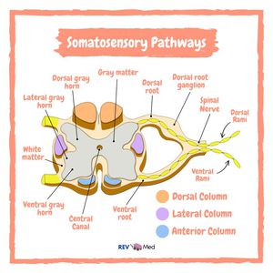 Basics of the Somatosensory pathways. Dorsal Column system & Antero-lateral system. Spinal cord is made up of the butterfly shaped gray matter and the rest as the white matter. The gray matter is divided between a dorsal (posterior), ventral (anterior) and some levels of the spinal cord have a lateral horn, as shown. While the gray matter has the cell bodies, the white matter consist of the column systems. The 3 Major White Matter Column Systems. Think of the tracts found in these columns as highways & dirt roads. The Dorsal Column system is a highway, and the Anterorior & Lateral Column systems are like dirt roads. It is because the dorsal column is heavily myelinated and fast, and the antero-lateral column is poorly myelinated. So the advanced system is the faster one, being the dorsal column because cars go faster on a highway. Dorsal Column (Dorsal Funiculus) the system in the back. *Only ascending tracts. *Advanced & Modern sensations *Highway - high velocity *Fine touch *2-point discrimination *Fast *More accuracy *Proprioception - sense of position *Better localized sensations from specific areas - highway lanes are consistent Anterior & Lateral Column systems *Both ascending and descending tracts. *Primitive & Old School sensations *Dirt Roads - low velocity *Crude touch *Pain *Temperature *Slower *Less accuracy *Sexual sensation *Poor localized sensations - dirt road lanes vary Check out our YouTube channel, easy to follow and learn Anatomy videos (link in bio) Instagram @rev.med