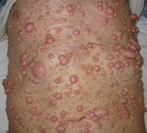 This is a case of neurofibromatosis. It is a rare genetic disorder that causes typically benign tumors of the nerves and growths in other parts of the body. Some people with this disorder have barely noticeable neurological problems, while others are affected profoundly. The cause is a genetic mutation in certain genes. In half of cases these are inherited from a person's parents while in the rest, they occur during early development. The tumors involve supporting cells in the nervous system rather than the neurons. There is no known prevention or cure. Surgery may be done to remove tumors that are causing problems.
