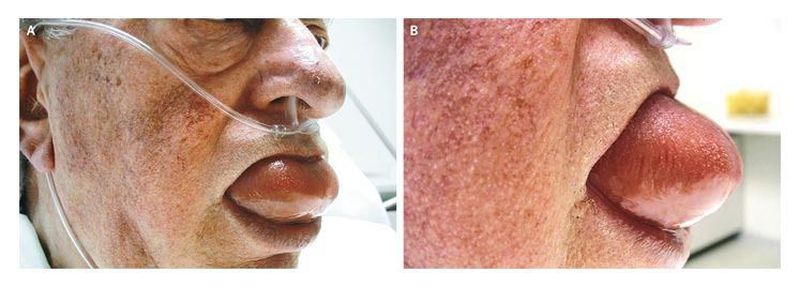 A 75-year-old man presented to the emergency department with diffuse swelling of his tongue that had begun a few hours earlier. He had no known history of allergies. He had been taking 25 mg of captopril twice daily for the past three years because of hypertension. On examination, he could neither speak nor swallow. He had a large, swollen, protuberant tongue (Panels A and B) and hypersalivation and was breathing through his nose. His blood pressure was normal. He had mild tachypnea, but not hypoxemia, stridor, or wheezing. Angioedema was diagnosed, and the patient was treated with epinephrine, antihistamines, and corticosteroids; the symptoms resolved over a three-hour period. Laboratory tests subsequently showed that tryptase and complement component levels (C1q, C3, and C4) were normal. The angioedema was likely due to the angiotensin-converting–enzyme inhibitor. Sjoerd W. Westra, M.D. Cornelis P.C. de Jager, M.D. Jeoen Bosch Ziekenhuis, Hertogenbosch, the Netherlands source: nejm.org
