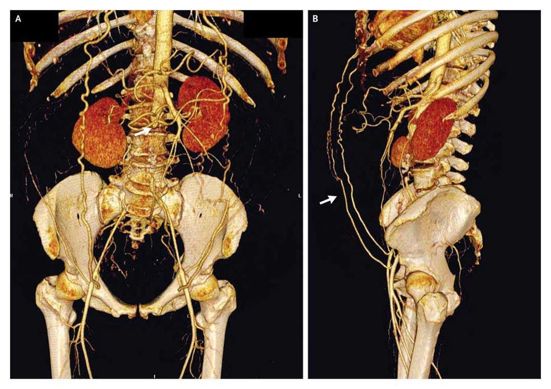 A 55-year-old woman awoke with an acute onset of bilateral leg numbness and weakness. Initial evaluation and lumbar magnetic resonance imaging, which was performed to assess the patient for disk disease, showed no cause for her symptoms, but her ankle pulses were noted to be diminished. The patient smoked cigarettes and had untreated hyperlipidemia; she reported that during the previous year, she had had bilateral buttock and thigh pain on walking 300 m. Her renal function was normal. Computed tomographic angiography showed complete occlusion of the infrarenal abdominal aorta (Panel A, arrow). A lateral view showed collateral blood flow from both internal thoracic arteries through subcutaneous epigastric abdominal vessels to the external iliac arteries (Panel B, arrow). Treatment included antiplatelet and statin therapy, successful smoking-cessation intervention, and exercise rehabilitation for peripheral artery disease. At 4 months, the patient's pain-free and maximal walking distances had improved. Distal aortic occlusion occurs most commonly in young women with dyslipidemia who smoke. Aortic atherosclerosis (a chronic process) with subsequent aortic occlusion (an acute thrombotic process) can occur without major threat to leg survival and function when collateralization is extensive, as was the case in this patient. Medical therapy can be effective, thus avoiding the risk of surgical revascularization. At her last visit, the patient had not required revascularization and was able to perform normal activities of daily living. Alan T. Hirsch, M.D. Michael D. Miedema, M.D. Abbott Northwestern Hospital, Minneapolis, MN 55407 source: nejm.org