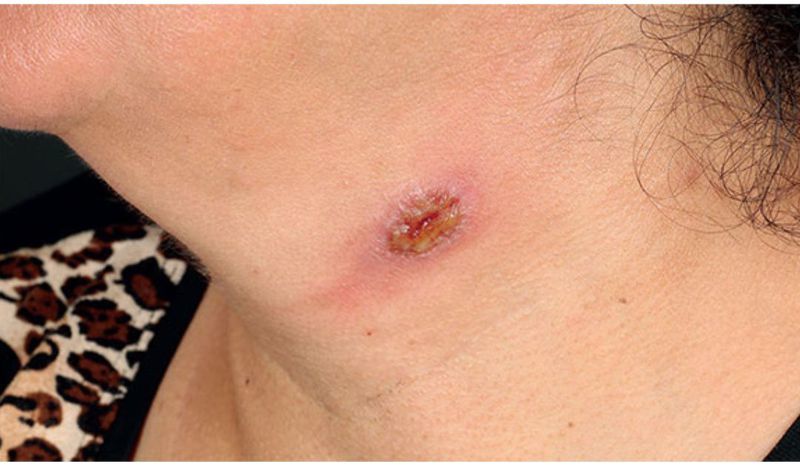 A 47-year-old woman presented with a 1-month history of a painful, ulcerated lesion with an erythematous border on the left side of her neck and submental lymphadenopathy. The lesion developed 4–5 weeks after a trip to Turkey. A)Squamous cell carcinoma B)Cutaneous leishmaniasis C)Extra-genital syphilitic chancre D)Scrofuloderma
