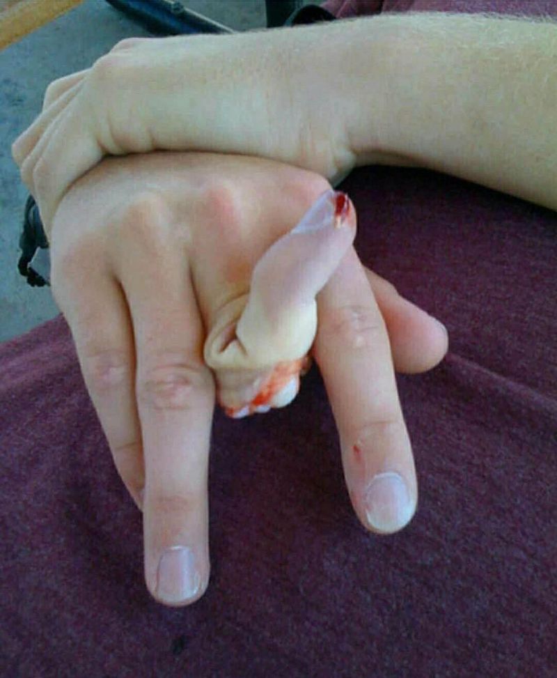Reason #1 why you shouldn’t show your middle finger to your wife!! This is an open dorsal dislocation of the proximal interphalangeal (PIP) joint with an associated fracture while playing American football after his middle finger was forced into hyperextension and a slight internal rotation! Fracture-dislocation of the PIP joint is a relatively rare sports injury, for which primary ligament repair after reduction of the dislocation is generally performed. Patients whose digits have neurovascular compromise, an open joint dislocation, ligamentous or volar plate rupture, joint instability, or an associated fracture should be immediately evaluated by an orthopedic or hand specialist to manage potential subtle ligamentous, cartilaginous, or bony injury. In this case a surgical treatment is indicated.