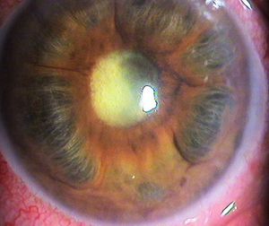 Glaucoma secundario Abombamiento del iris por obstrucción en el drenaje del humor acuoso