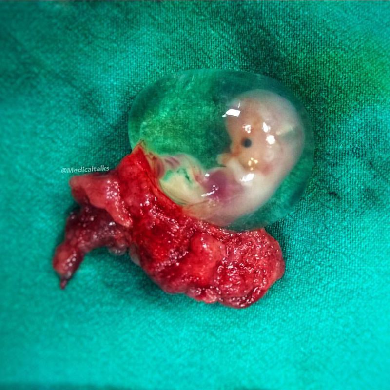 Ectopic pregnancy is the result of a flaw in reproductive physiology that allows the conceptus to implant and mature outside the endometrial cavity, which ultimately ends in the death of the fetus. It is basically an extrauterine pregnancy, the vast majority in the Fallopian tubes. Ectopic means 'misplaced'. The fallopian tubes are not designed to hold a growing embryo; thus, the fertilized egg in a tubal pregnancy cannot develop properly. When a fetus does develop, it is non-viable for life. The diagnosis of ectopic pregnancy is based upon a combination of measurement of the serum quantitative human chorionic gonadotropin (beta-hCG, indicating there is a pregnancy) and findings on transvaginal ultrasonography (determining the location). Visualization of an intrauterine sac, with or without fetal cardiac activity, is often adequate to exclude ectopic pregnancy. It may be unruptured or ruptured at the time of presentation to medical care. Tubal rupture (or rupture of other structures in which an ectopic pregnancy is implanted) can result in life-threatening hemorrhage. Any symptoms suggestive of rupture should be noted. These include severe or persistent abdominal pain or symptoms suggestive of ongoing blood loss (eg, feeling faint or loss of consciousness). The fetus was removed and the placental site was found to be adjacent to, and involving, the left fallopian tube.