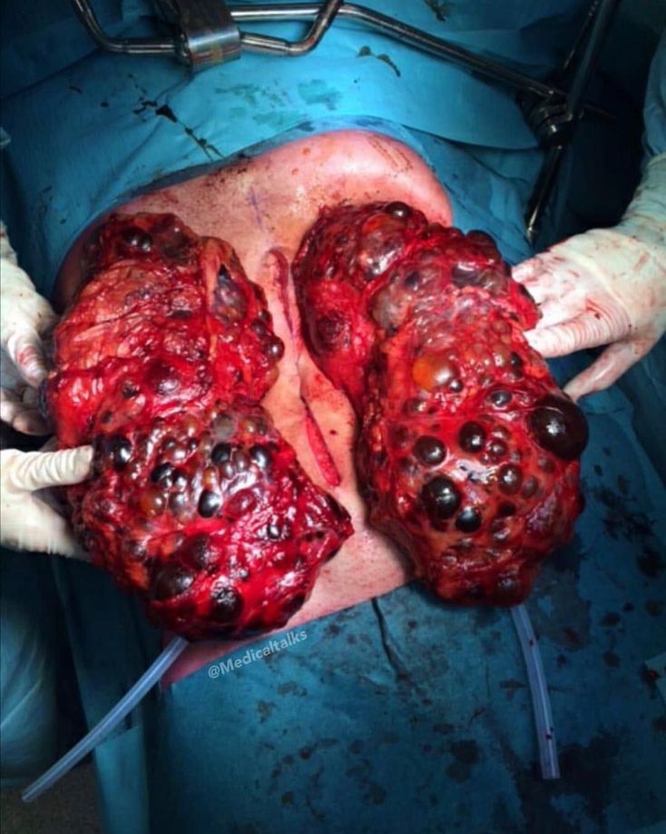 Two kidneys, 15 pounds each. Notice how big they are compared to the surgeon’s hand! This patient suffered from a chronic kidney failure (end-stage renal disease) due to polycystic kidney disease. He had both kidneys removed and underwent a kidney transplantation from his wife, who was miraculously found to be a suitable donor. Notice how both kidneys demonstrate a large number of cysts of variable size (from a few mm to many cm), which are filled with fluid of variable color - from clear or straw colored to altered blood or chocolate colored to purulent when infected. In Polycystic kidney disease, the clusters of fluid-filled sacs, or cysts, interfere the kidneys ability to filter waste products from the blood. The growth of cysts causes the kidneys to become enlarged and can lead to kidney failure. The majority of cases are inherited in an autosomal dominant fashion. The kidneys are normal at birth, and with time develop multiple cysts. At the age of 30 years, approximately 2/3 of patients will have visible cysts by ultrasound. That figure increases over time, such that essentially all patients eventually demonstrate cystic change. By the age of 60 years approximately 50% of patients have end stage renal failure. The risk of renal cancer is not increased. Frequent complications are dangerously high blood pressure (hypertension), pain in the back or sides, blood in the urine (hematuria), recurrent urinary tract infections, kidney stones, and heart valve abnormalities. A non-invasive, reliable and inexpensive diagnosis is made by ultrasound. There's currently no cure for PKD, but current treatment to manage problems caused by the condition are dialysis and transplant.