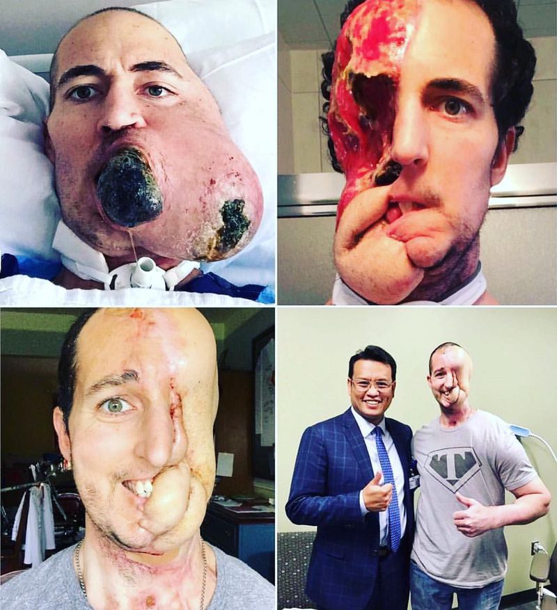 This man named Tim had a cancerous tumor that had grown to the size of a melon and had it rebuilt by a pioneering surgeon!! Tim, 38, was diagnosed with Synovial Sarcoma, an extremely rare form of soft tissue cancer, which left him with the grapefruit-sized tumor growing on his face. An amazing transformation story about a cancer patient who lost half his face and had it reconstructed by plastic surgeon, Dr. Kongkrit Chaiyasate. After losing half his face from removing the cancerous tumor, he had his face rebuilt by a pioneering surgeon. McGrath had been living with exposed flesh on his face since 2015 with several failed attempts at facial reconstruction. Tim was first diagnosed with Synovial Sarcoma in February 2014 after complaining of severe jaw pain. An MRI revealed an egg sized tumour however Tim turned down surgery and spent the following 18 months seeking none surgical alternatives. At the end of May 2015 the tumor doubled in size and he had to have a tracheotomy fitted to enable him to breathe and a feeding tube so he could eat, because the tumor had invaded the space in his mouth. He was admitted to hospital where he remained for almost seven weeks following the initial 30 hour operation to remove and then reconstruct his face. To eradicate all the cancerous cells, the surgery required the removal of his eye, ear, half of his jawbone, muscle, tissue, skin and some of his skull. Plastic surgeon, Dr. Chaiyasate, managed to rebuild McGrath's face using flesh from his forearm and leg. Following the successful surgery, McGrath called Dr. Chaiyasate a "human angel." He has performed five successful surgeries for McGrath which have greatly improved his quality of life. Future operations may allow McGrath to eat and drink without tubes again. Credit : @plasticsurgery •Medicogram• #surgery #medicine #now #plasticsurgery #doctors #medicogram