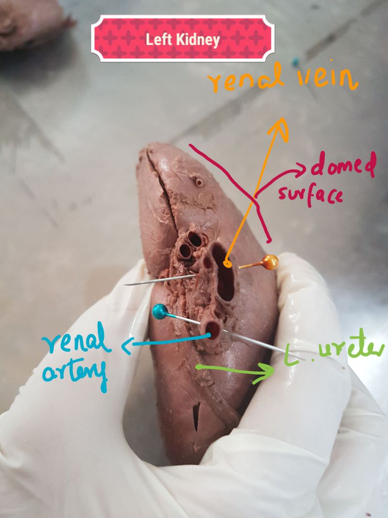 How to tell which kidney is this (L or R)! 1)renal vein is most anterior and superior 2)domed surface should be anteriorly placed 3)ureter is most posterior and hangs down 4)renal artery is inferior and a little posterior Ureter~Renal artery~Renal vein (from post. to ant.)