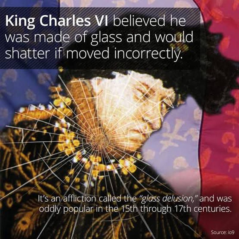 I just learned about the glass delusion and maybe you want to know about it, so i'm going to share it. So what is it all about ? Way back in history, a medieval French King Charles VI suffered from extraordinary psychiatric illness which made him think that he was made of glass. He used to wrapped himself with cotton blankets to prevent him from breaking. The people who suffered from this case, were seems to be normal. But, the belief that they were made of glass made them think that no one should ever come close to them, to avoid the risk of shattering. *Photo credit to the owner *