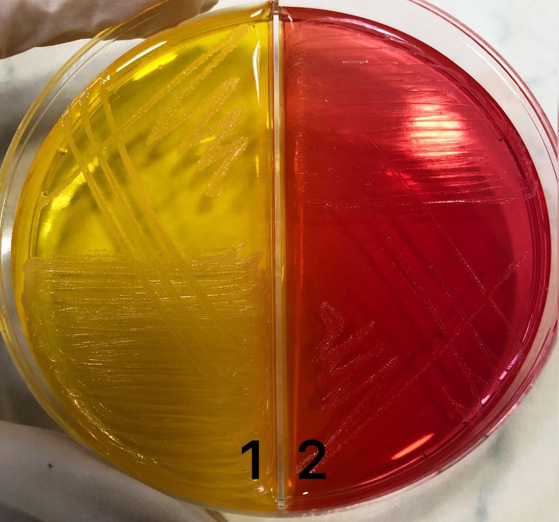 Mannitol salt agar used for identification Stahylococcus species. If agar's colour changes from pink to yellow, this is Stahylococcus aureus (picture 1). If agar's colour doesn't changes, this is Staphylococcus epidermidis (picture 2).