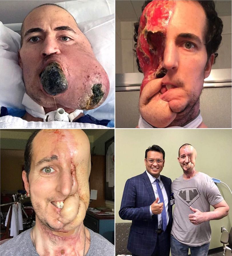 Tim, 38, was diagnosed with Synovial Sarcoma, an extremely rare form of soft tissue cancer, which left him with the grapefruit-sized tumor growing on his face. An amazing transformation story about a cancer patient who lost half his face and had it reconstructed by plastic surgeon, Dr. Kongkrit Chaiyasate. After losing half his face from removing the cancerous tumor, he had his face rebuilt by a pioneering surgeon. McGrath had been living with exposed flesh on his face since 2015 with several failed attempts at facial reconstruction. Tim was first diagnosed with Synovial Sarcoma in February 2014 after complaining of severe jaw pain. An MRI revealed an egg sized tumour however Tim turned down surgery and spent the following 18 months seeking none surgical alternatives. At the end of May 2015 the tumor doubled in size and he had to have a tracheotomy fitted to enable him to breathe and a feeding tube so he could eat, because the tumor had invaded the space in his mouth. He was admitted to hospital where he remained for almost seven weeks following the initial 30 hour operation to remove and then reconstruct his face. To eradicate all the cancerous cells, the surgery required the removal of his eye, ear, half of his jawbone, muscle, tissue, skin and some of his skull. Plastic surgeon, Dr. Chaiyasate, managed to rebuild McGrath’s face using flesh from his forearm and leg. Following the successful surgery, McGrath called Dr. Chaiyasate a “human angel.” He has performed five successful surgeries for McGrath which have greatly improved his quality of life. Future operations may allow McGrath to eat and drink without tubes again. Special credit : @plasticsurgery