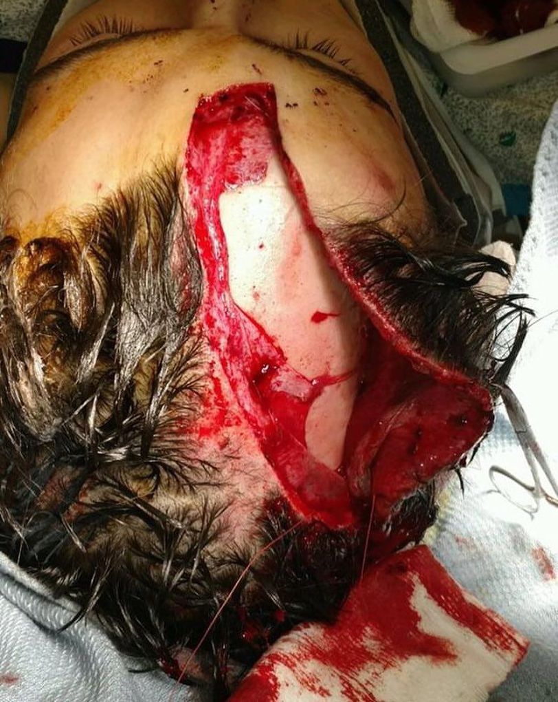 Scalp lacerations are a common injury. Clinical evaluation should identify associated serious head injury, laceration of the galea, or bony defect of the skull. The scalp should be examined carefully to evaluate for signs of injury to the underlying structures. The layers of concern in the scalp include the subcutaneous tissue, galea aponeurosis, connective tissue and periosteum overlying the bone. Visible or palpable bony defects warrant computed tomography of the head to determine presence of intracranial injury or penetration of the wound through the skull. Control of profuse bleeding and prevention of further loss of blood is crucial. After hemostasis is achieved and the wound is irrigated, scalp lacerations are typically closed with surgical staples under local anesthesia. Sutures may be preferred over staples for large, gaping wounds and to provide hemostasis for wounds with brisk bleeding.