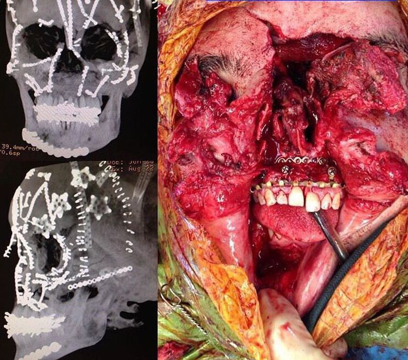 This patient suffered a severe facial trauma after a car accident.Severe facial injury after MVC and extensive reconstruction. The patient also had intracranial injuries that were treated by a neurosurgeon. We were able to save the both eyes and he preserves the vision despite the critical orbital fractures. The reason for that many plates is because need to reconstruct all the vertical and horizontal columns of the face to maintain adequate hight, width and AP projection. The surgery last 8 hours and involved multiple facial approaches and bone grafts from the calvariumm