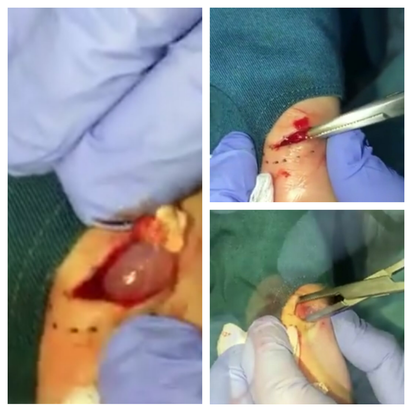 A ganglion cyst is a tumor or swelling on top of a joint or the covering of a tendon (tissue that connects muscle to bone). It looks like a sac of liquid (cyst). Inside the cyst is a thick, sticky, clear, colorless, jellylike material. Depending on the size, cysts may feel firm or spongy