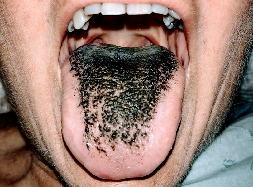 Black hairy tongue is a condition of the tongue in which the small bumps on the tongue elongate with black or brown discoloration, giving a black and hairy appearance. The appearance may be alarming, but it is a harmless condition. Predisposing factors include smoking, xerostomia (dry mouth), soft diet, poor oral hygiene and certain medications. Management is by improving oral hygiene, especially scraping or brushing the tongue. The cause is uncertain, but it is thought to be caused by accumulation of epithelial squames and proliferation of chromogenic (i.e., color-producing) microorganisms. There may be an increase in keratin production or a decrease in normal desquamation (shedding of surface epithelial cells). Many people with BHT are heavy smokers. .