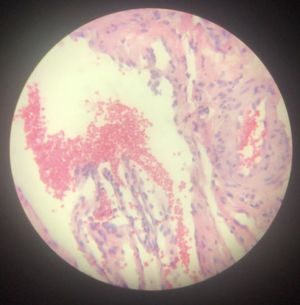 Kaposi sarcoma tumor showing fascicles of spindled cells with extravasated red blood cells and scattered chronic inflammatory cells