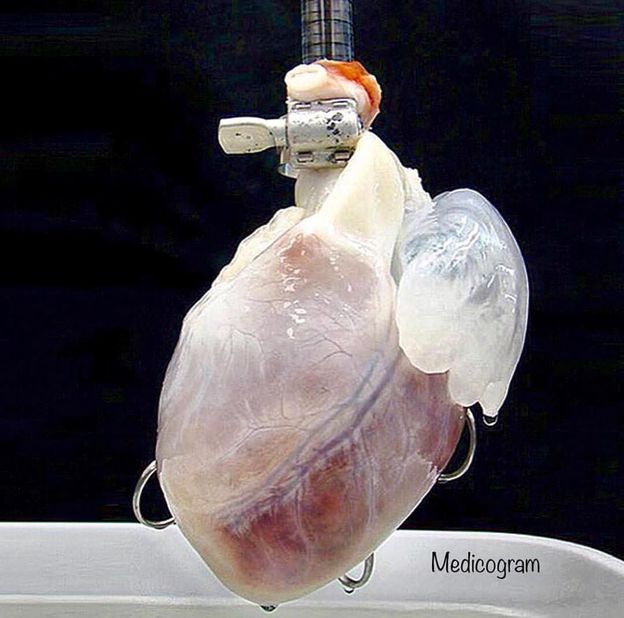 Decellularization is the process used in biomedical engineering to isolate the extracellular matrix (ECM) of a tissue from its inhabiting cells, leaving an ECM scaffold of the original tissue, which can be used in artificial organ and tissue regeneration. This scaffold of connective tissue can then be reseeded with a patient's own cells, with the goal of regenerating an organ that can be transplanted into the patient without fear of tissue rejection. This image shows a decellularized heart with the vascular system still intact, in which the cells have been stripped away, and the remaining scaffold has been infused with stem cells. This will help grow a new human heart, which can be implanted into a patient.