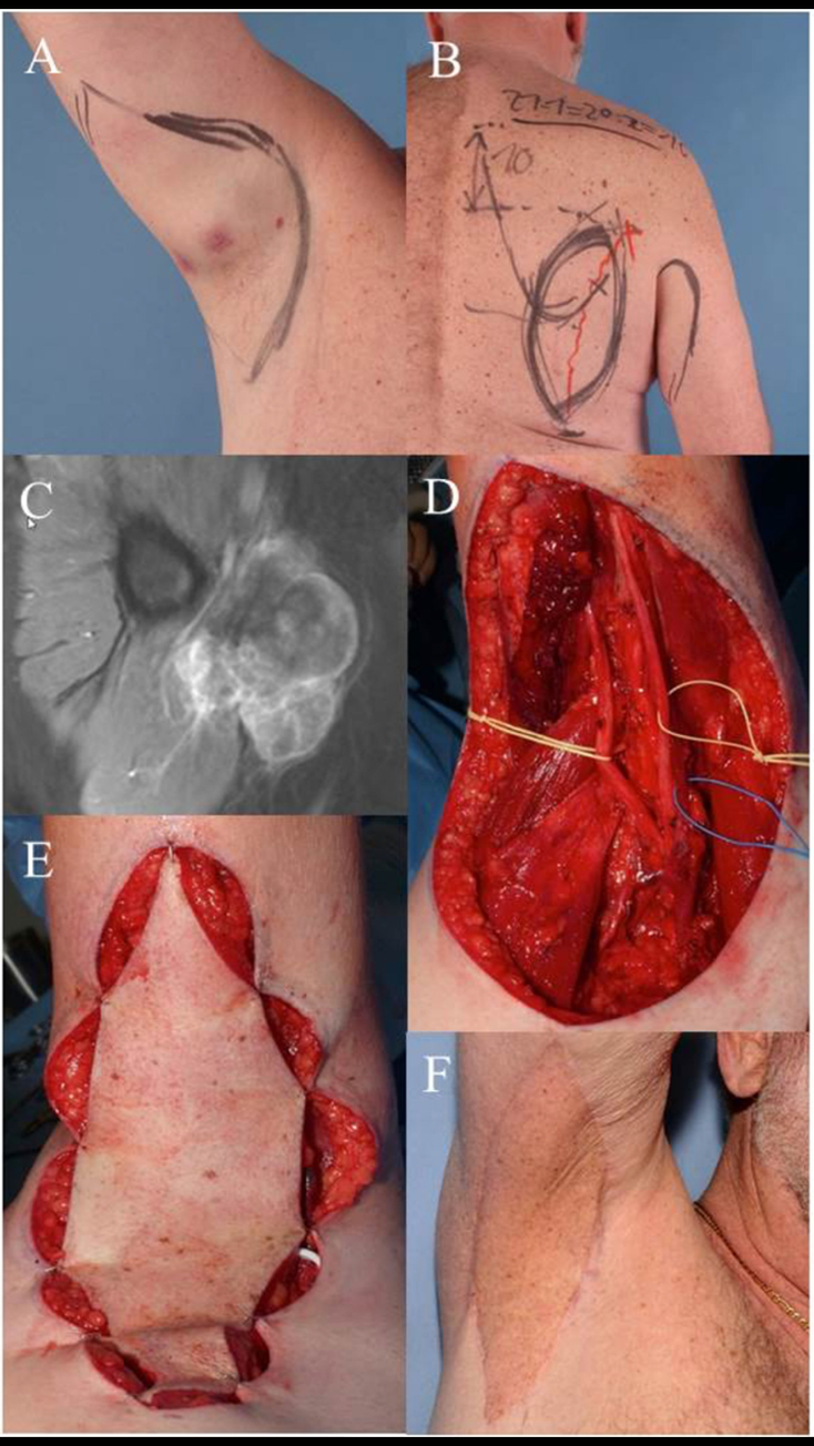 Pre-OP drawing demonstrates planned pedicled parascapular fasciocutaneous flap. (C)Pre-OP MRI of the right axilla. (D)Intraoperative situation after wide en-bloc excision of tumor. Deep margins were achieved by epineurectomy and adventitiectomy. (E) Pedicled parascapular flap inset reconstructs the defect. (F) Clinical appearance 5 years after surgery and external post-OP radiation therapy. demonstrates the case of a 64-year-old male patient suffering from a high-grade pleomorphic sarcoma in the right axilla (T2b, N0, M0, G3). A wide excision was planned and carried out with sufficient removal of skin and subcutaneous tissue due to the extracompartimental localization of the sarcoma. Margins to the deep structures of the axilla could be achieved by thorough dissection of the nerve and vessel sheaths. The transfer of a pedicled parascapular flap was performed in the same operation. Noteworthy, we dissect the pedicle completely back through the medial axillary gap, ligating the osseous branches of the circumflex scapular artery. The flap can be advanced through this tunnel, allowing a completely tension-free placement in the axilla. The patient is shown 5 years after surgery and post-OP radiation therapy with an excellent functional result. The parascapular flap delivers sufficient pliable soft tissue coverage avoiding functional impairment of shoulder movement (53–55).