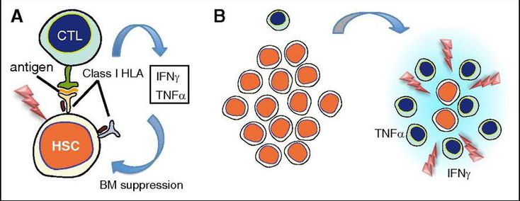 Acquired aplastic anemia is a rare, serious blood disorder, due to failure of the bone marrow failure to produce blood cells. Bone marrow is the spongy substance found in the center of the bones of the body, in adults mainly the spine, pelvis, and large bones of the legs. The bone marrow contains hematopoietic stem cells. Stem cells can produce more stem cells (self-renewal) and also differentiate and proliferate, giving rise to red blood cells (erythrocytes), white blood cells (leukocytes), and platelets. In acquired aplastic anemia, an almost complete absence of hematopoietic stem cells results in low levels of red and white blood cells and platelets (pancytopenia). Symptoms of aplastic anemia are those of anemia, bleeding, and infection. Although bone marrow failure can occur secondary to other disorders, most aplastic anemia is due to the immune system mistakenly targeting the bone marrow (autoimmunity). Indeed, most patients can respond to therapy that suppresses the immune system, usually ATG and cyclosporine.