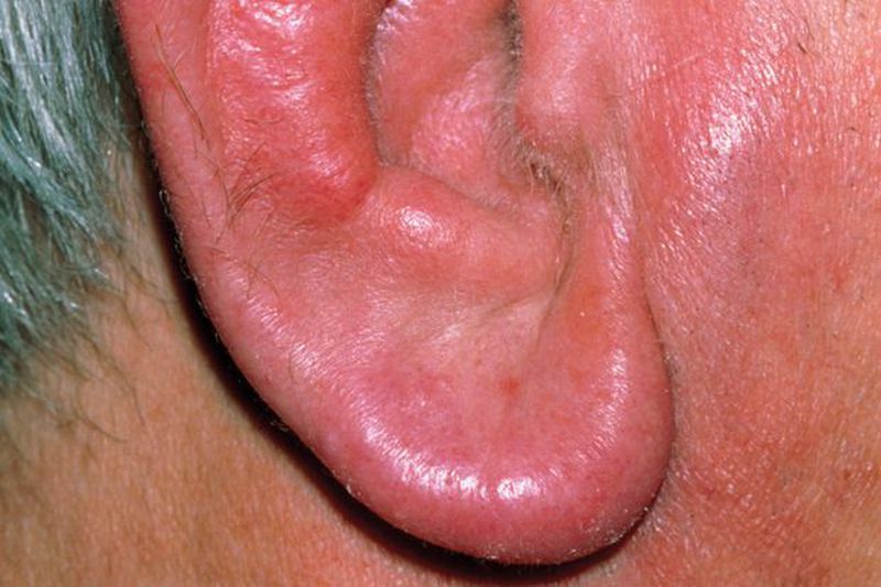 Relapsing polychondritis (RP) is a rare systemic disease characterised by recurrent, widespread chondritis of the auricular, nasal, and tracheal cartilages. Additional clinical features include audiovestibular dysfunction, ocular inflammation, vasculitis, myocarditis, and nonerosive arthritis. Although the cause remains unknown, the etiology is suspected to be autoimmune.1 A concomitant autoimmune disease is present in around a third of patients with RP.2 RP usually presents in the fourth and fifth decade and affects men and women equally