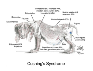 The most common cause of hyperadrenocorticism in dogs is a benign (non-spreading) pituitary tumor. Malignant tumors of the pituitary, which metastasize through the body, are a much less frequent cause of hyperadrenocorticism. When a dog’s Cushing’s disease develops because of problems within the pituitary gland, the condition is called pituitary-dependent hyperadrenocorticism (PDH). PDH is responsible for approximately 80 to 85 percent of cases of naturally occurring hyperadrenocorticism in dogs. Tumors within the adrenal gland (adrenal-dependent hyperadrenocorticism or ADH) are responsible for the other 15 to 20 percent of cases of naturally occurring Cushing’s disease in dogs. Adrenal tumors have about an equal chance of being benign or malignant.