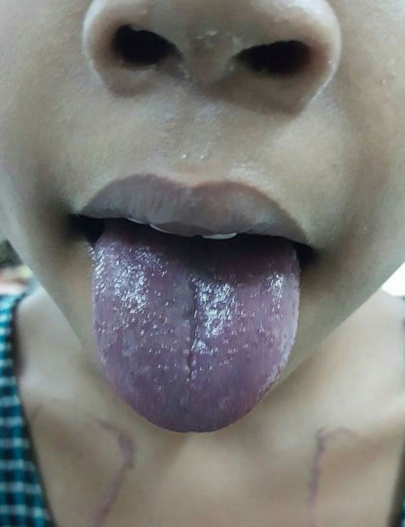 Blue tongue disease Major signs are high fever, excessive salivation, swelling of the face and tongue and cyanosis of the tongue. Swelling of the lips and tongue gives the tongue its typical blue appearance, though this sign is confined to a minority of the animals. Nasal signs may be prominent, with nasal discharge and stertorous respiration.