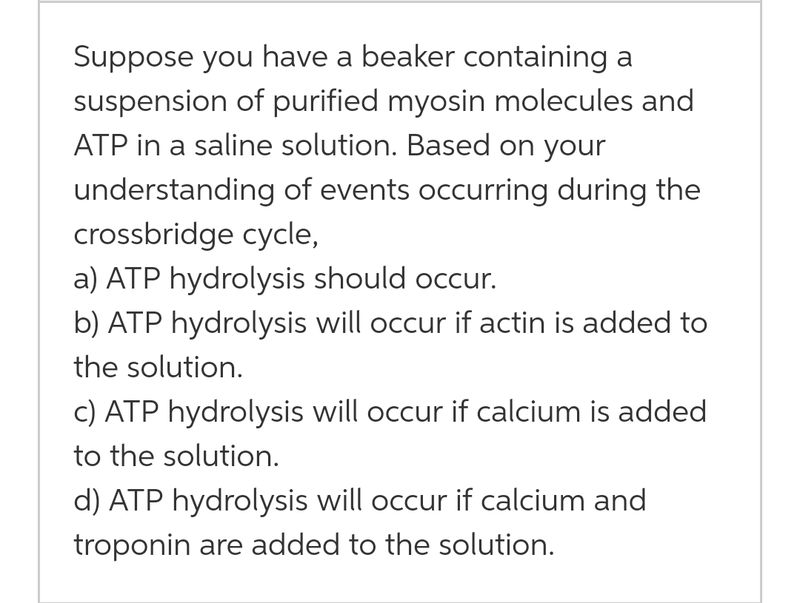 I think with questions like this it’s easier to simplify the question after you’ve read all the answers. The underlying question is “what cause ATP hydrolysis during muscle contraction”. The answer to that question is “ATP hydrolysis occurs at the myosin ATPase” I would agree that A is the correct answer because myosin ATPase induces hydrolysis of ATP allowing interaction with actin. B is incorrect as actin does not hydrolyse ATP. C is wrong as calcium results in the conformational change of troponin which exposes the actin filament so that actin and myosin can interact but does not play a role in ATP hydrolysis. D is wrong for the same reason as answer C. Anyone feel free to correct me if my reasoning is incorrect! I think it is safe to say that only a small amount of ATP would be hydrolysed initially without repetitive cross bridge cycling. I would read up further on the muscle contraction as I am just a student and no expert!