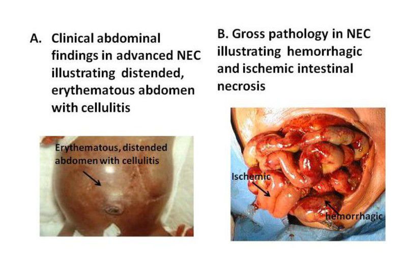 Necrotizing enterocolitis (NEC) is an acute inflammatory disease of the gastrointestinal tract of preterm infants that was initially described in the 1950s. The pathology of NEC can range from limited mucosal injury to full thickness necrosis of the small and large intestine. The distribution of injury may be focal, segmental, multifocal, or diffuse. The three most common signs of NEC are as follows: • Abdominal distention • Bloody stools (grossly bloody, or heme-positive for occult blood); and • Excessive gastric residuals (fed infants) or bilious gastric aspirates (unfed infants). OVERVIEW: What every practitioner needs to know Are you sure your patient has necrotizing enterocolitis (NEC)? What are the typical findings Necrotizing enterocolitis (NEC) is an acute inflammatory disease of the gastrointestinal tract of preterm infants that was initially described in the 1950s. The pathology of NEC can range from limited mucosal injury to full thickness necrosis of the small and large intestine. The distribution of injury may be focal, segmental, multifocal, or diffuse. The three most common signs of NEC are as follows: • Abdominal distention (See Figure 1) • Bloody stools (grossly bloody, or heme-positive for occult blood); and • Excessive gastric residuals (fed infants) or bilious gastric aspirates (unfed infants). Other signs referable to gastrointestinal pathology include vomiting, diminished to absent bowel sounds with ileus, abdominal tenderness, cellulitis of the abdominal wall, and less commonly, a palpable abdominal mass. The effects of the acute inflammatory process in NEC typically extend beyond the gastrointestinal tract. Systemic signs such as lethargy, new onset or increased episodes of apnea, new onset of respiratory distress or worsening of respiratory distress, poor color, diminished peripheral perfusion, bleeding diasthesis, hypotension, bradycardia, and shock syndrome are almost always observed at some stage in the disease process. These systemic signs may occur even if cultures of blood and other body fluids are sterile. Pathology similar to NEC in preterm infants has occurred in term infants with other conditions such as cyanotic congenital heart disease, Hirschsprung’s disease, imperforate anus, intestinal atresia, and severe perinatal asphyxia. However, the etiology and pathogenesis of intestinal injury in these situations likely differs from that of classic NEC in preterm infants. Isolated intestinal perforation (IIP) is a distinct entity that results from a punctate perforation of the gastrointestinal tract. IIP can present with marked abdominal distention due to a pneumoperitoneum and systemic signs of sepsis due to intraperitoneal spillage of fecal organisms. This entity has been associated with medications such as indomethacin and steroids.