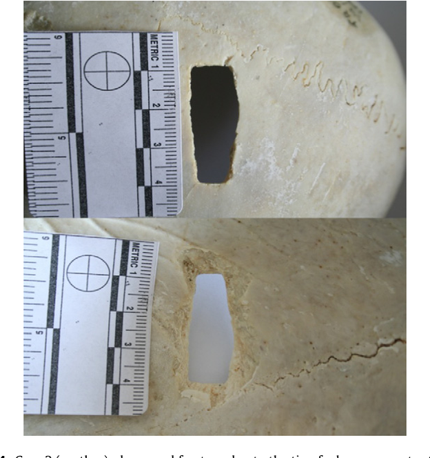 Case 2 (mother): depressed fracture due to the tip of a hammer: outer table of the skull (up); inner table of the skull (down).