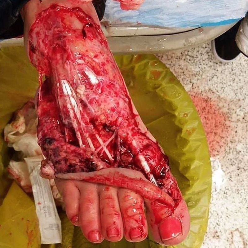 The patient’s foot got stuck on the back wheel while not wearing proper gear, exposing the foots extensor tendons. Motorcycle accidents continue to be a source of severe injury, especially to the foot. The most common foot injury is a metatarsal fracture; however, there must be a high index of suspicion for associated injuries. Although these injuries are associated with a low mortality rate, they require prompt assessment and treatment to limit long-term morbidity and disability.
