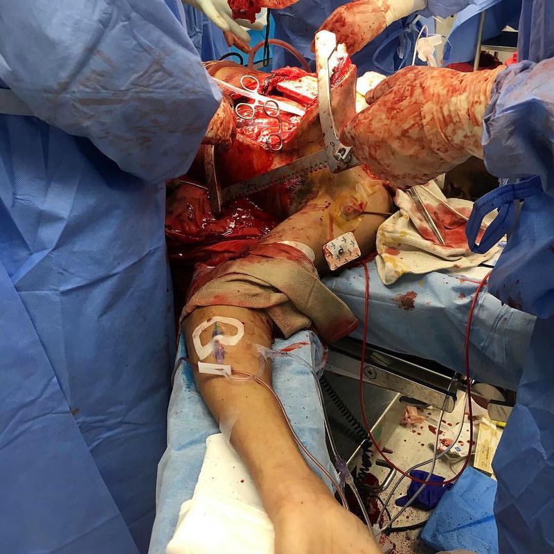 The patient above got stabbed in chest during a fight. At the emergency department, he was intubated but shortly after went into pulseless electrical activity The need for immediate operation was clinically obvious at presentation and an emergency clamshell thoracotomy was performed, which essentially gives access to repair the aorta that was lacerated in the attack. The thoracotomy was performed by making a wide incision extending across the chest, along the fourth intercostal space from midaxillary to midaxillary and through the sternum. The thoracic cavity was then exposed by means of a sternal retractor placed at both ends of the cut sternum. The wound was packed during the procedure to slow down the rapid exsanguination during the traumatic arrest. Overall, clamshell incision is a good first choice for ED thoracotomy. It provides a rapid and easy access to all structures within the thoracic cavity with one incision; improved visualisation, assessment and identification of injuries within the thorax; and quick manipulation of the thoracic structures. Injuries of this nature are rarely survivable. The repair was successful and the patient survived closure. Photo by @dirtdoc8404