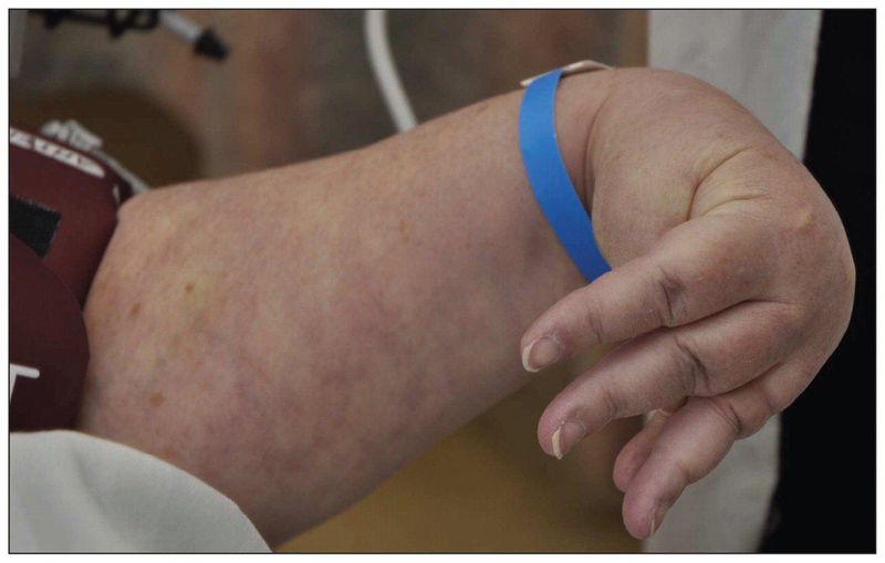 A 50-year-old woman presented with a two-day history of diarrhea, vomiting, progressive numbness around her mouth and generalized body cramps. One year before presentation, she had undergone a total thyroidectomy for a multinodular goiter. She also had a history of depression, hypertension and chronic renal impairment. She reported taking citalopram, rabeprazole for gastroesophageal reflux disease, calcium carbonate, levothyroxine and vitamin B12. Her vital signs were stable. Trousseau sign was evidenced a few seconds after the sphygmomanometer cuff was inflated to more than the systolic blood pressure on the left upper arm.