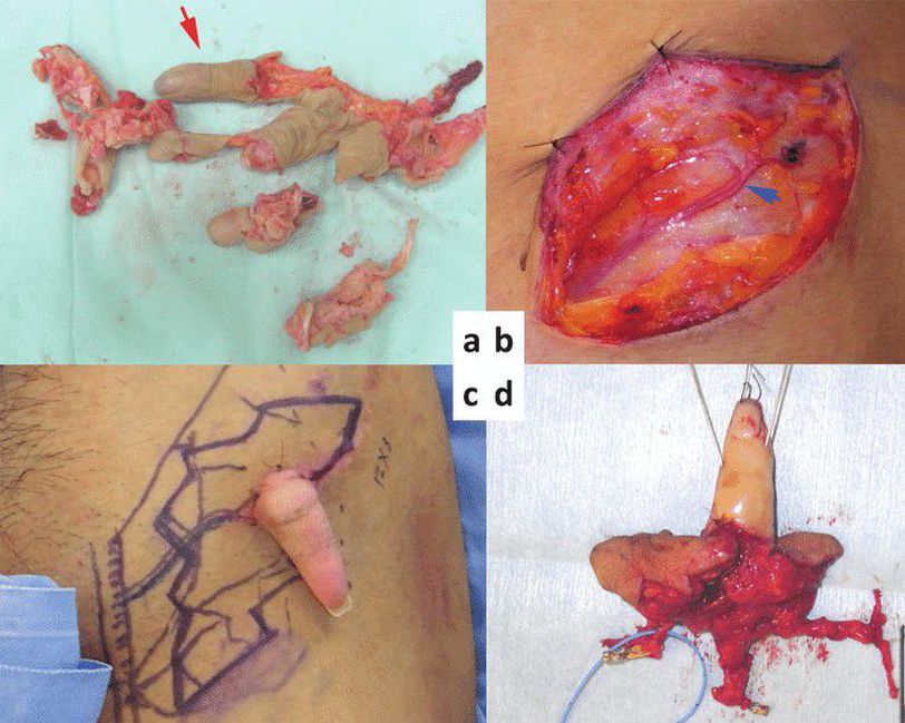 (a) Amputated little finger (arrow). (b) Left groin superficial circumflex iliac artery perforator (SCIP) (arrow). (c) Extopic chimeric flap design 3 months after ectopic implantation. (d) Chimeric SCIP flap with vascularized lateral femoral cutaneous nerve. Ectopic implantation was first reported by Godina, who implanted a subtotal amputated hand in the axilla in 1986.1 In 1996, Graf et al2 temporarily implanted ring and little fingers amputated at the level of metacarpophalangeal joints into the forearm. Salvage of amputated thumbs temporarily implanted into the ulnar and dorsalis pedis was reported by Li et al3 in 2008. We present 2 cases in which amputated fingers were salvaged and reconstructed by means of temporary ectopic implantation using perforator vessels and prefabricated chimeric flaps. CASE REPORTS Case 1 A 30-year-old man suffered a mangling injury of his right hand after it was caught in a meat grinder. All fingers were severely crushed with the exception of the little finger, which was intact distal to the proximal interphalangeal joint (Fig 1a). The hand was also crushed and ablated. We planned an ectopic implantation of the little finger to provide enough time to fully debride and optimize the hand in preparation for reimplantation of the little finger. The superficial circumflex iliac artery perforator (SCIP) and subdermal vein were first identifiednear the anterior superior iliac spine (Fig 1b). The diameter of the SCIP and the little finger digital artery were 0.4 mm and 0.6 mm, respectively. The digital artery of the little finger was anastomosed to the SCIP by using IVaS method.4 Three months after ectopic implantation of the little finger, the little finger was elevated with an SCIP flap (12 × 3 cm), containing the lateral femoral cutaneous nerve (4 cm), a superficial circumflex iliac artery and vein (SCIA and SCIV), and superficial inferior epigastric artery (SIEA) (Figs 1c and 1d). Because the litter finger is shorter than a normal size finger, the right second metacarpal bone with a dorsal metacarpal artery was harvested and placed distally on the 5th metacarpal bone (Figs 2a and 2b). The SCIA and SIEA originate from a common trunk, which was anastomosed to the base of the 5th common digital artery. The dorsal metacarpal artery of the second metacarpal bone was anastomosed to the distal end of the SIEA (Fig 2d). The SCIV and subdermal vein of SCIP flap were anastomosed to the dorsal veins of the hand. The vascularized lateral femoral cutaneous nerve was anastomosed to both ends of the 5th digital nerve. Sensation in the little finger recovered, with a Semmes-Weinstein test result of 4.08 and moving 2 PD of 8 mm at 10 months, and SCIP flap also had sensation with a Semmes-Weinstein test of 4.31.