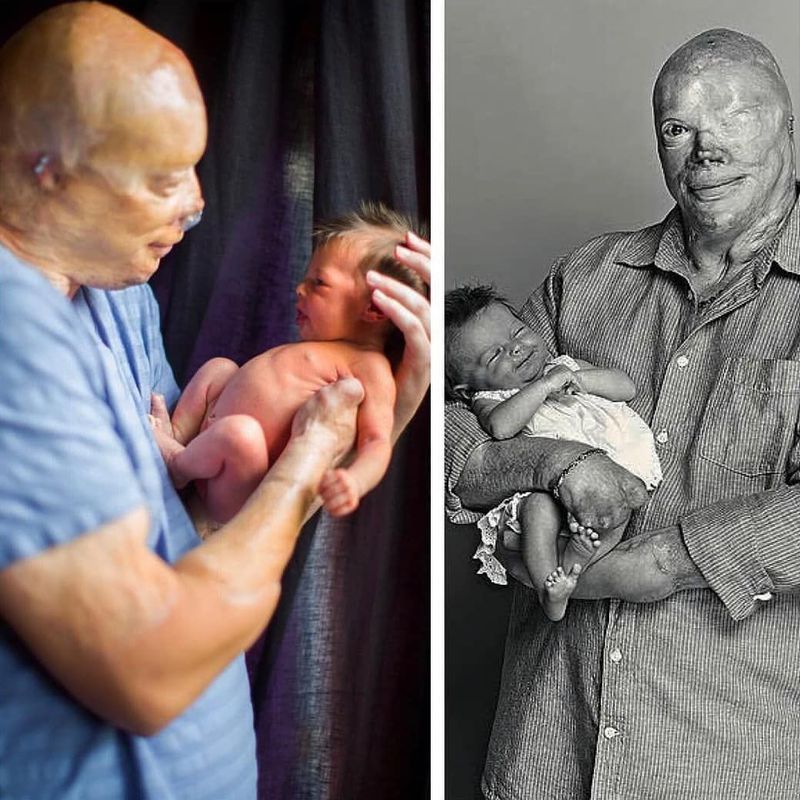 This is Joe. On February 20th, 2003 while enjoying a rock concert with a girlfriend, Karla, a special effects malfunction caused a fire to break out. The nightclub was way over capacity. Realizing quickly what was going on I made my way from near the front row to the nearest exit. In an effort to protect Karla, I placed my leather vest over her. As we made it towards the exit people fell in front of me and then on top of me. Karla suffocated and did not survive, but she was not burned. I was trapped and conscious throughout the entire ordeal. I could hear everything going on around me. The sounds of yelling were quite loud. Then it grew quieter and quieter. Then it was just me. Next, I heard the voice of a firefighter, “we’ve got one over here.” To date I have had 122 tune-ups (surgeries) and counting. I will continue to have surgeries for the rest of my life. I met my fiancé, Carrie, at the World Burn Congress in Vancouver in 2007. 2 years later, we got engaged. Now we have a baby, Hadley. Hadley’s so cute. I feel happy, nervous, fulfilled. Nobody knows what’s coming in an hour or two or five. I’m just determined to be the best dad I can be. I went into surgery to receive a hand transplant – so now I can feel my baby daughter’s soft hair.