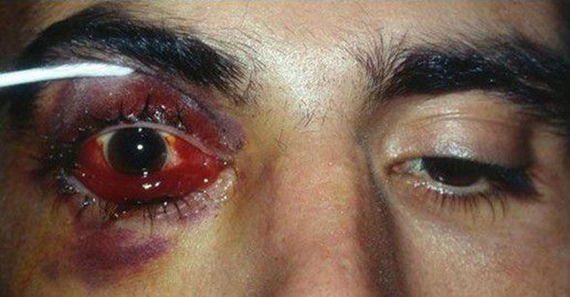 Raccoon eyes (panda eyes) or periorbital ecchymosis is a sign of basal skull fracture or subgaleal hematoma, acraniotomy that ruptured the meninges . Bilateral hemorrhage occurs when damage at the time of a facial fracture tears the meninges and causes the venous sinuses to bleed into the arachanoid villi and the cranial sinuses. In lay terms, blood from skull fracture seeps into the soft tissue around the eyes. Raccoon eyes may be accompanied by Battle's sign anecchymosis behind the ear. These signs may be the only sign of a skull fracture, as it may not show on an X-ray. They may not appear until up to two hours after the injury.It is recommended that the patient not blow their nose, cough vigorously, or strain to prevent further tearing of the meninges