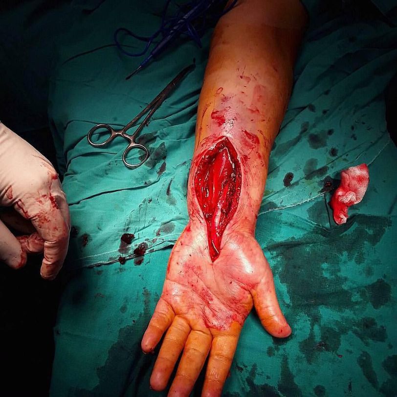 Upper limb fasciotomy in acute compartment syndrome!! π€πΌ This patient has developed a muscular compartment syndrome. This condition happens after revascularization of an acutely ischemic limb in a patient who has an ischemic or traumatic injury to a muscle group that causes acute muscular edema. Compartment syndrome is a painful condition caused by increased intracompartmental pressure, compromising perfusion and resulting in muscle and nerve damage within that compartment, resulting in edema of the muscle. Because many muscles are encased in an inelastic, fascial compartment, edema increases the volume, and ultimately the pressure, within the compartment. As the pressure builds up, muscle perfusion decreases, resulting in further ischemic injury, which worsens the edema. As the compartment pressure approaches 20-40 mm Hg, irreversible ischemic injury of muscles and nerves may occur, with motor or sensory loss or loss of the distal arterial pulses. In this case, a fasciotomy was performed to open the compartment of the forearm. Typically, the muscle bulges out at the point of excision, relieving the pressure and improving perfusion. Once the acute episode is resolved, the fasciotomy is closed with a split-thickness graft. The patient receives a physic therapy, is placed on chronic anticoagulation therapy with warfarin, and retains a functional limb.