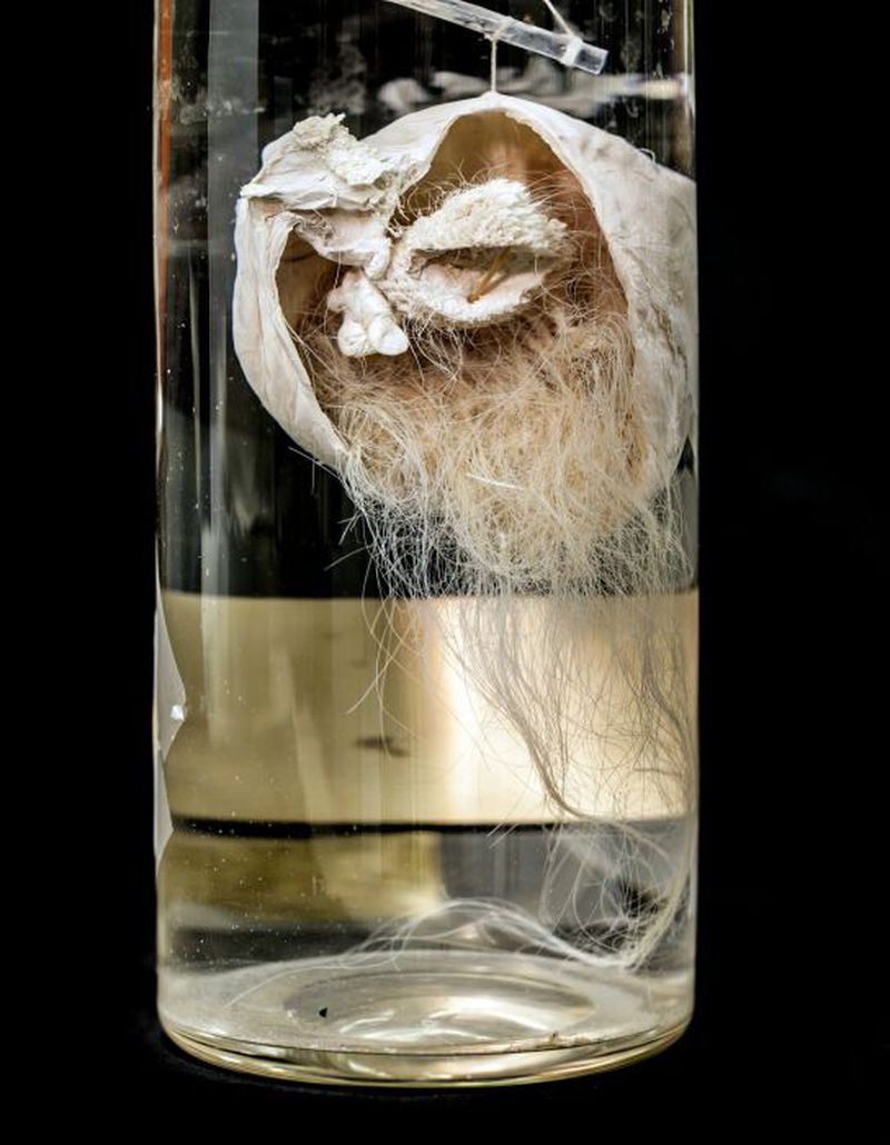 A dermoid cyst is a type of teratoma, a tumor named from the Greek word teras, meaning “monster.” These usually benign masses contain developmentally mature cells of tissues found in the human body such as skin, hair, teeth, and bone. This specimen was removed in 1884 from a 23-year-old woman, which is an age typical of a patient with this condition. Dermoid cysts of the ovaries are thought to be present at birth and grow for decades. They are usually discovered in a woman's reproductively mature years when the cysts grow large enough to become painful or otherwise disruptive.