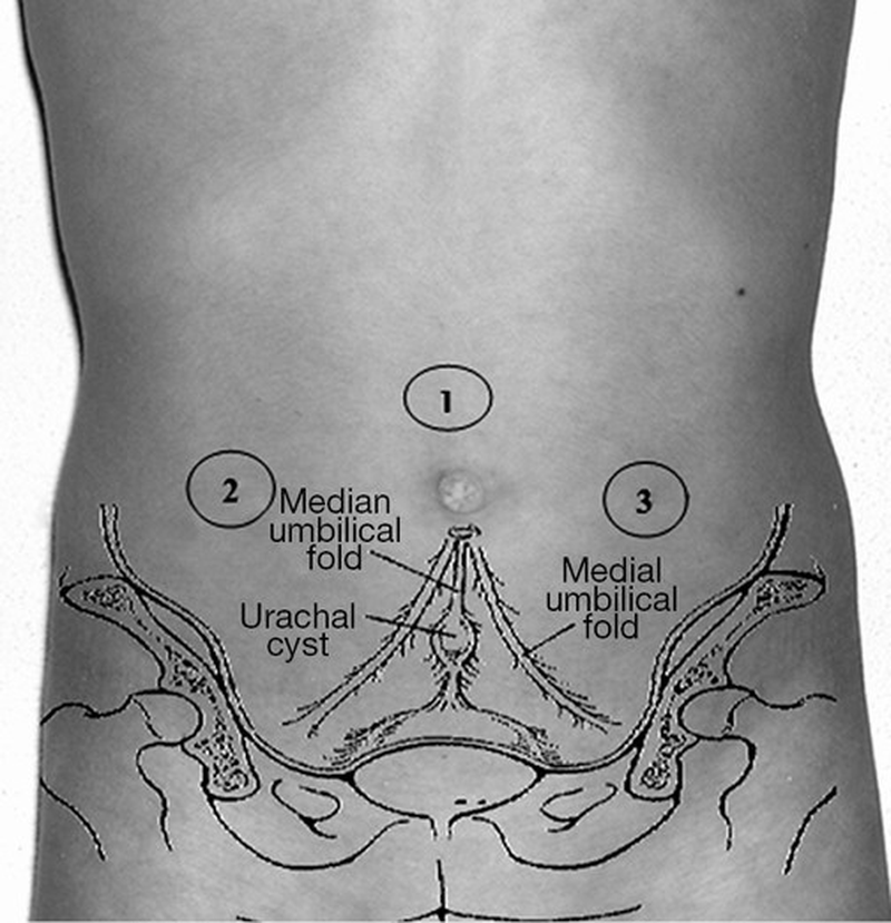 We included in this retrospective study all patients treated in our Department for urachal anomalies between 2006 and 2016 focusing our attention on urachal cysts diagnosis and mini-invasive treatment. This period was considered because in 2006 we started to treat this pathology laparoscopically. In a total of 16 patients 8 (50%), (6 females, 2 males) underwent open excision of an urachal remnant. The average age was 5.5 years (range, 4 months–13 years). The other eight patients were treated by laparoscopic surgery. We reviewed the charts of this group of patients to determine: age at surgery, preoperative imaging results, operative time, need for conversion, hospital stay length, postoperative complications. In this group signs and symptoms at onset were abdominal pain (acute in one patient and recurrent in two ones), macrohematuria and dysuria (1 pt), umbilical urinary discharge (3 pts), omphalitis with urinary umbilical discharge (1 pt). All patients underwent ultrasound, urinalysis was performed in 3 patients, while one of the eight was studied also with voiding cysto-urhethrogram and renal scintigraphy. The suspect of urachal remnant was based on the clinical symptoms and signs. All patients were operated on laparoscopically. Surgical technique: all patients were administered a single dose of parenteral Amoxicillin/Sulbactam during induction of anesthesia. The patient is placed in supine position with both arms secured at the side of the body. Foley’s catheterization of bladder was performed to initially decompress the bladder during the dissection of the urachal remnant and later allows a retrograde distension of the bladder at the time of wire the insertion of the urachus at the dome of the bladder. The operating table should be preferably inclined at 20°–30° in Trendelenburg position to allow the abdominal contents to fall in a cephalad manner away from the pelvis. The surgeon and the camera surgeon stand on the right side of the patient (at the patient’s head in younger ones) with the monitor in the opposite side of the patient (normally at the foot). Trocars position: the first 5 mm trocar can be placed with “open” technique infraumbilically and if this is not possible in the sovraumbilical region. Once the port is placed inside the peritoneal cavity, is created an appropriate pneumoperitoneum with CO2 pressures, which range from 6–8 to 12 mmHg according to the patient’s weight. A 5-mm 0° or 30° angled lens camera (according the surgeon’s preference) is inserted and under direct vision other two 3-mm/5-mm trocars are placed respectively in the right and left iliac fossa. A third accessory trocar can be placed in case