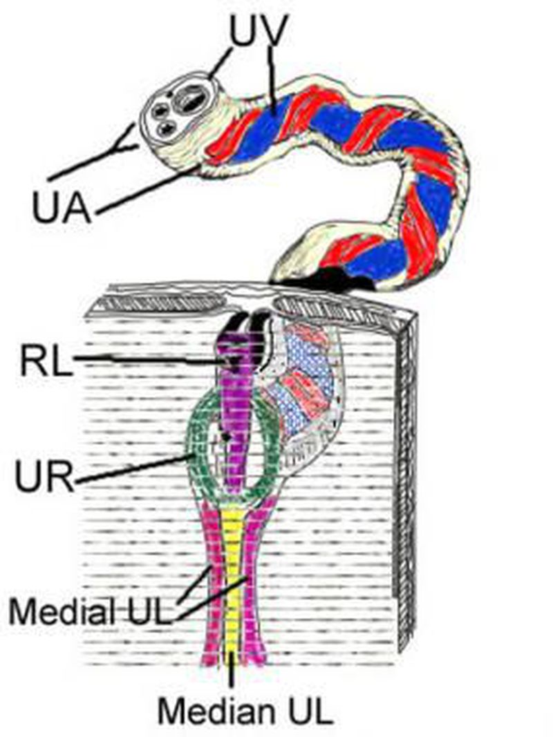 Most umbilical procedures can be performed on an elective basis, and surgery should be scheduled when the child is in his or her usual state of health. The exceptions are infants with necrotizing infections and those with stool draining from the umbilicus, indicative of an enteric-umbilical fistula. Mechanical bowel preparation is not needed. Perioperative antibiotics are used for sinuses and fistulas. Antibiotics are not needed for umbilical hernia repairs. General anesthesia is used. The child is placed supine. The abdomen should be widely prepared with antiseptic solution and draped in standard fashion. Omphalomesenteric and urachal remnants can be approached directly through the umbilicus or through an incision in the infraumbilical or supraumbilical crease. Larger children may need additional or larger incisions. Laparoscopy can be performed through the umbilical incision. During exploration of the umbilicus, an attempt is made to identify all anatomic structures (see the image below). A history of infection and resultant inflammation or scar tissue can complicate identification of normal and abnormal structures. Dissection of the umbilicus off the fascia is often useful and can provide access for a small port to perform laparoscopy. The umbilical vein (round ligament), the umbilical arteries (medial umbilical ligaments), and the urachus (median umbilical ligament) can often be identified.