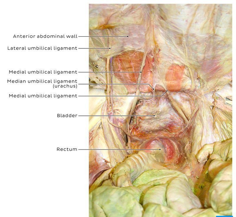 Explanation to Objectives Objectives The development and normal progression of the urachus including its remnant in the adult.The differential diagnosis of an urachal cyst.How a pathologist would be able to determine that the extirpated structure was derived from the urachus.The potential complications of an urachal cyst. Urachus The urachus is a fibrous embryonic connection between the urinary bladder and the umbilicus. It is the remnant of an earlier embryologic structure, the allantois. In the adult the urachus is known as the median umbilical ligament (Figure 5) a fibrous cord deep to the transversalis fascia, which remains connected to the bladder and the umbilicus. Urachal cyst differential diagnosis The differential diagnosis for an urachal cyst in an adult would include vitelline duct anomalies, appendicitis, granulomatous inflammations, and granulation tissue from the umbilical stump. Pathological confirmation Microscopic analysis of the cyst could make the diagnosis that this structure was a urachal rather than a mesenteric cyst (also would be attached to mesentery) because the lining cells of a urachal cyst are urothelium(transitional epithelium), as would be expected based on the embryological origin of this cyst (Figure 6). In contrast, mesentericcysts would likely be lined by a mesothelium (simple cuboidal or squamous epithelium typical of mesenteric lining).