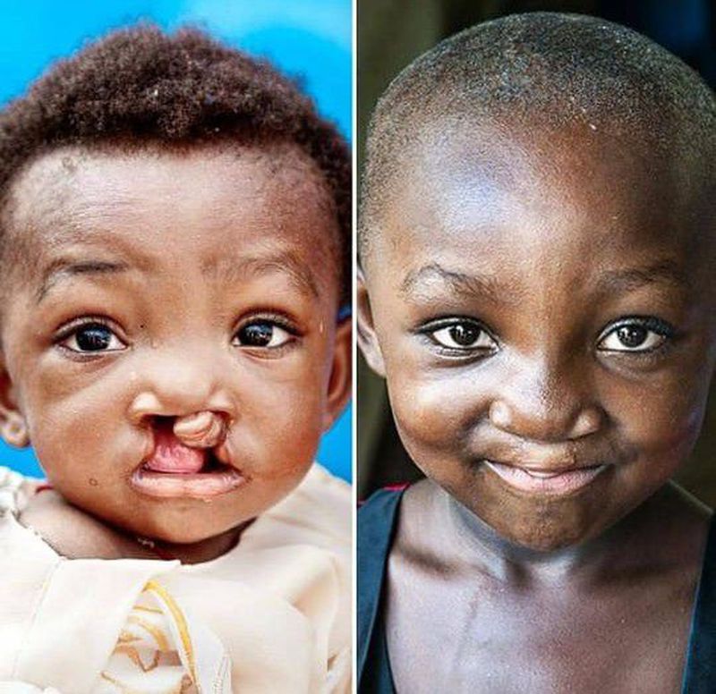 This is cleft lip and cleft palate... It's a birth deffect , this happens when the tissues which are responsible for making the lip and palate do not join properly...at the time of foetal development.....I think I m correct π