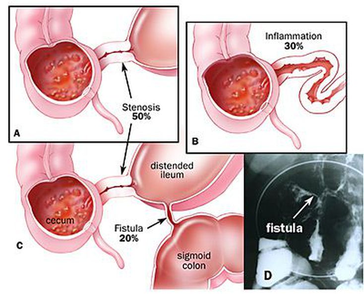 Crohn's disease often begins in a person's teens or twenties, though some patients experience symptoms even earlier. Most common symptoms include: Abdominal cramps Diarrhea Delayed growth (in younger children), which often occurs before gastrointestinal symptoms begin Weight loss Fever Anemia There are different types of Crohn's disease, depending on which part of the gastrointestinal tract is affected. Each subtype of the disease has its own specific symptoms. Patients sometimes experience non-intestinal symptoms that are more problematic than the bowel problems. These include: Colitic arthritis, an arthritis that migrates along the body and affects knees, ankles, hips, wrists and elbows Pericholangitis, inflammation of the tissues around the bile ducts Kidney stones Urinary tract complications Fistulas