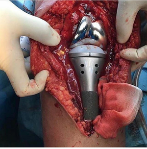 Intra operative pic taken of a knee replacement. This patient required the prosthesis due a tibial tumor!
