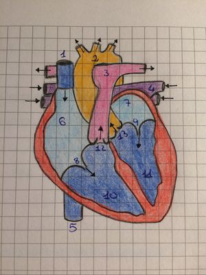 1-vena cava superior 2-aorta 3-arteria pulmonar 4-vena pulmonar 5-vena cava inferior 6-aurícula derecha 7-aurícula izquierda 8-válvula tricúspide 9-válvula mitral 10-ventrículo derecho 11-ventrículo izquierdo 12-válvula pulmonar 13-válvula aórtica