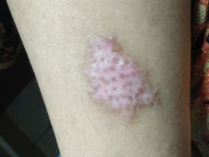 Healing lesion with eczema of around 10 days/secondary marginal excoriation laterally/ Recovering Tenia versicolor lesions