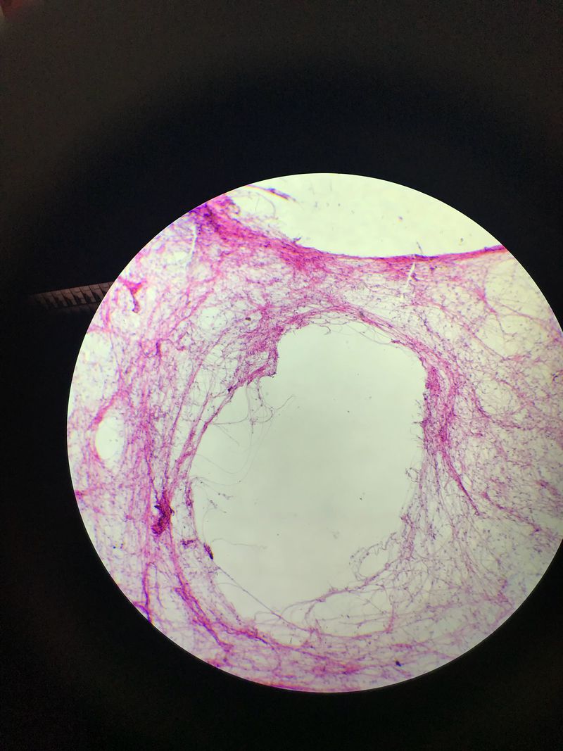 If you can see in this slide, the collagen fibres are loosely arranged among the connective tissue cells.